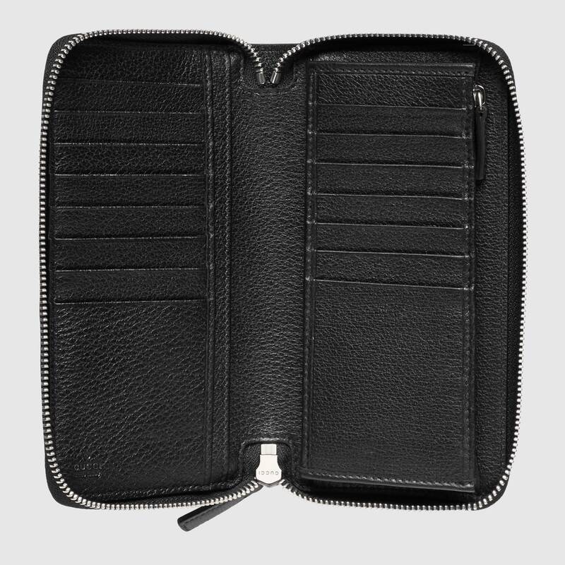 グッチならではの新しいディテールであるGUCCIジャカード ストライプは、1980年代のスポーツウェアのサイドに配されていたテープロゴからインスピレーションを得たものです。最新コレクションでは、このスポーティーなモチーフがブラック グレイニーレザーのジップアラウンドウォレットを飾っています。