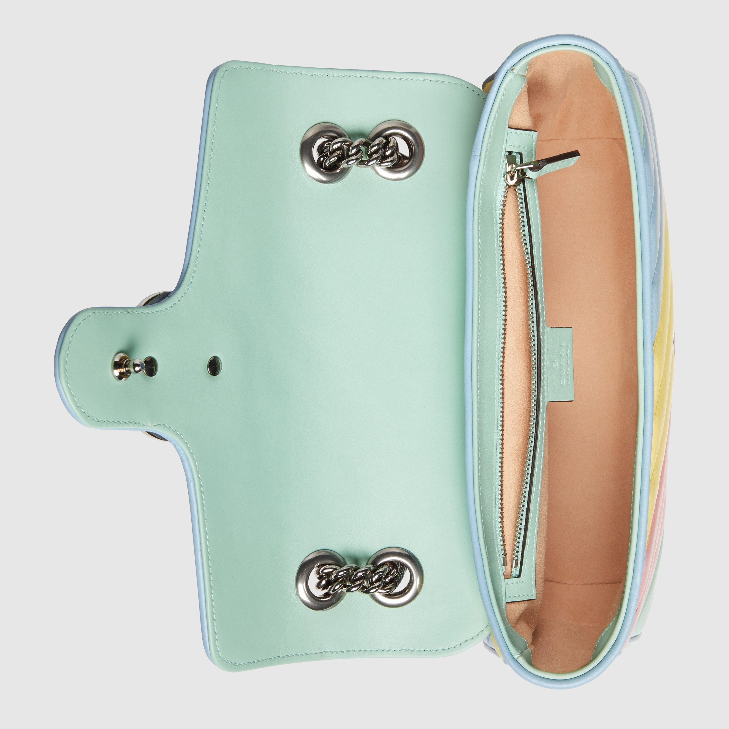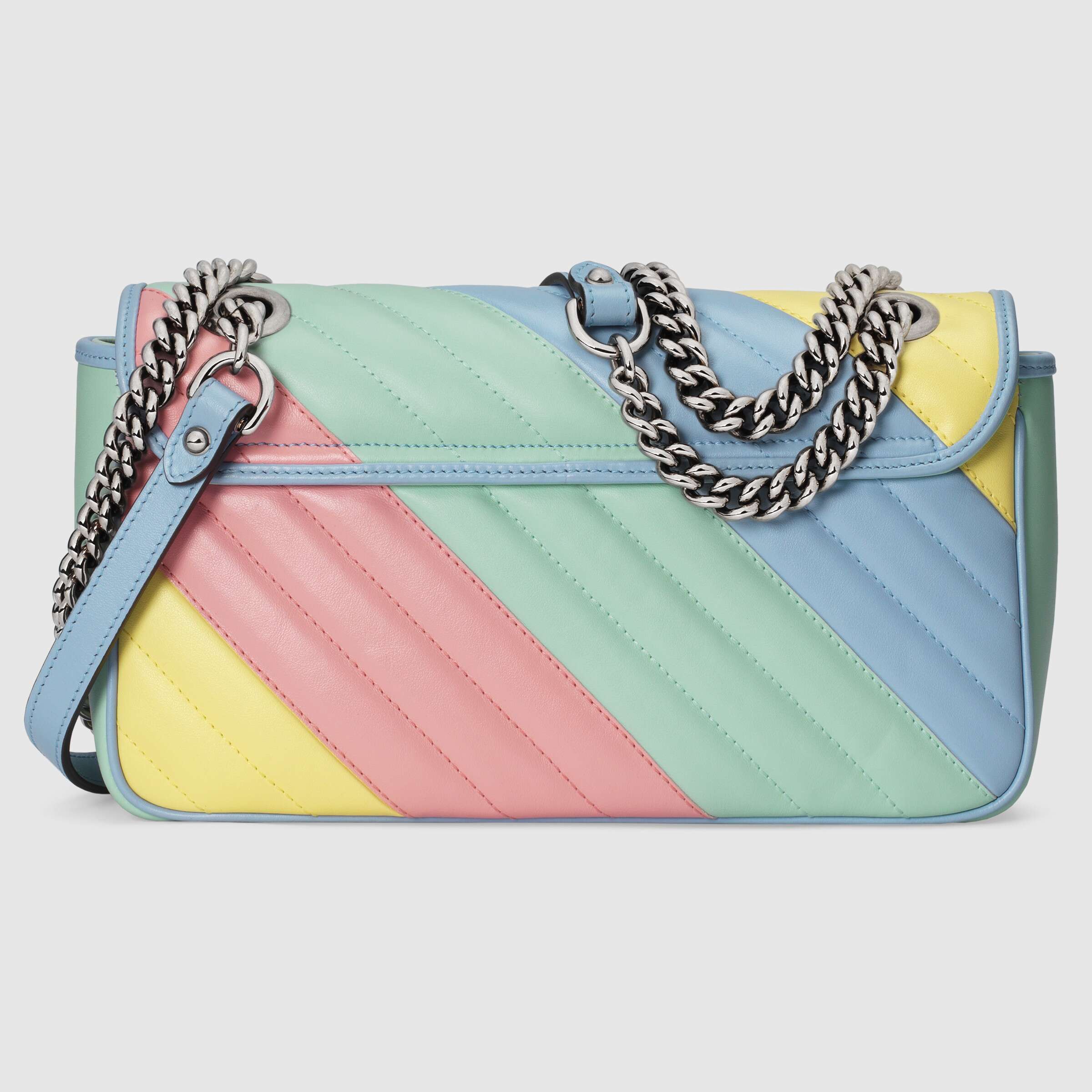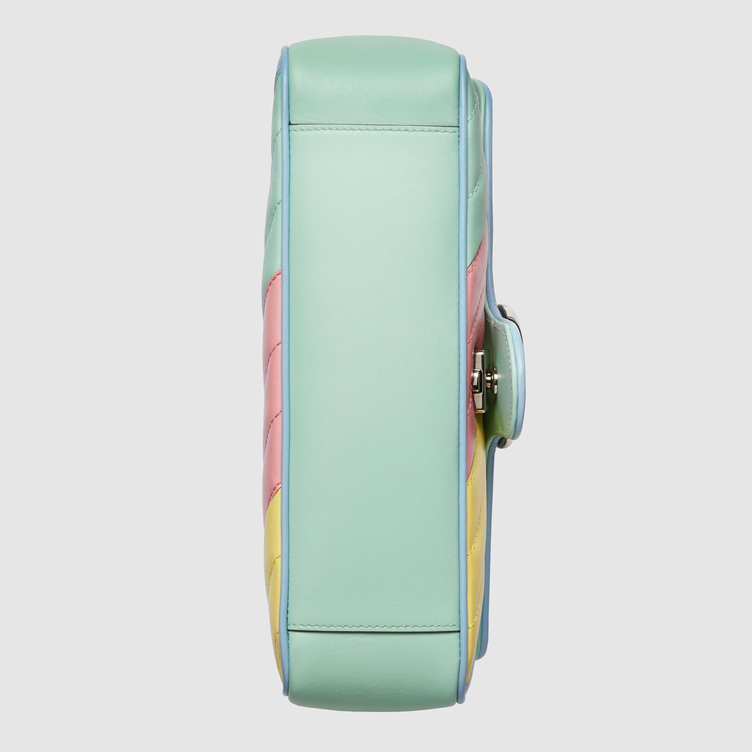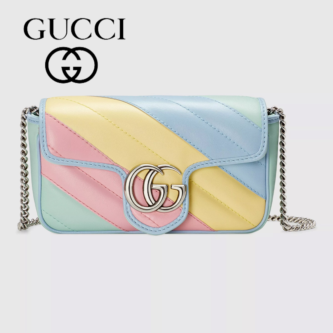 ややかっちりとしたフォルムとシンプルなフラップ クロージャーが特徴的なスーパーミニサイズの〔GGマーモント〕バッグ。今やグッチを代表するエレメントのひとつとなっている、立体感のあるダブルG ハードウェアは、1970年代のアーカイブデザインからインスピレーションを得たものです。デザインのキルティングレザーで仕立てたこのバッグは、新しいパステルカラーを採用し、ソフトで明るい色調にフォーカスした最新コレクションならではのアイテムです。