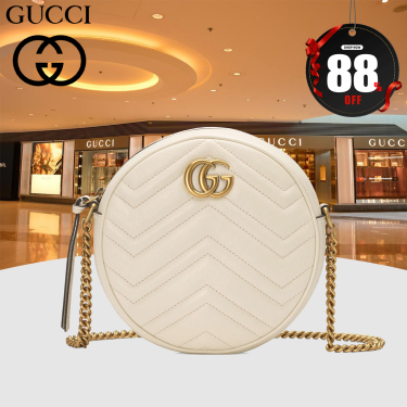 〔GGマーモント〕ラインの新作ミニバッグ。ラウンドフォルムにチェーン ショルダーストラップが付いています。ヴィンテージ感漂うこのバッグのフロントにはグッチを象徴するダブルG ハードウェア、バックにはシェブロン キルティング レザーのハート ディテールがあしらわれています。